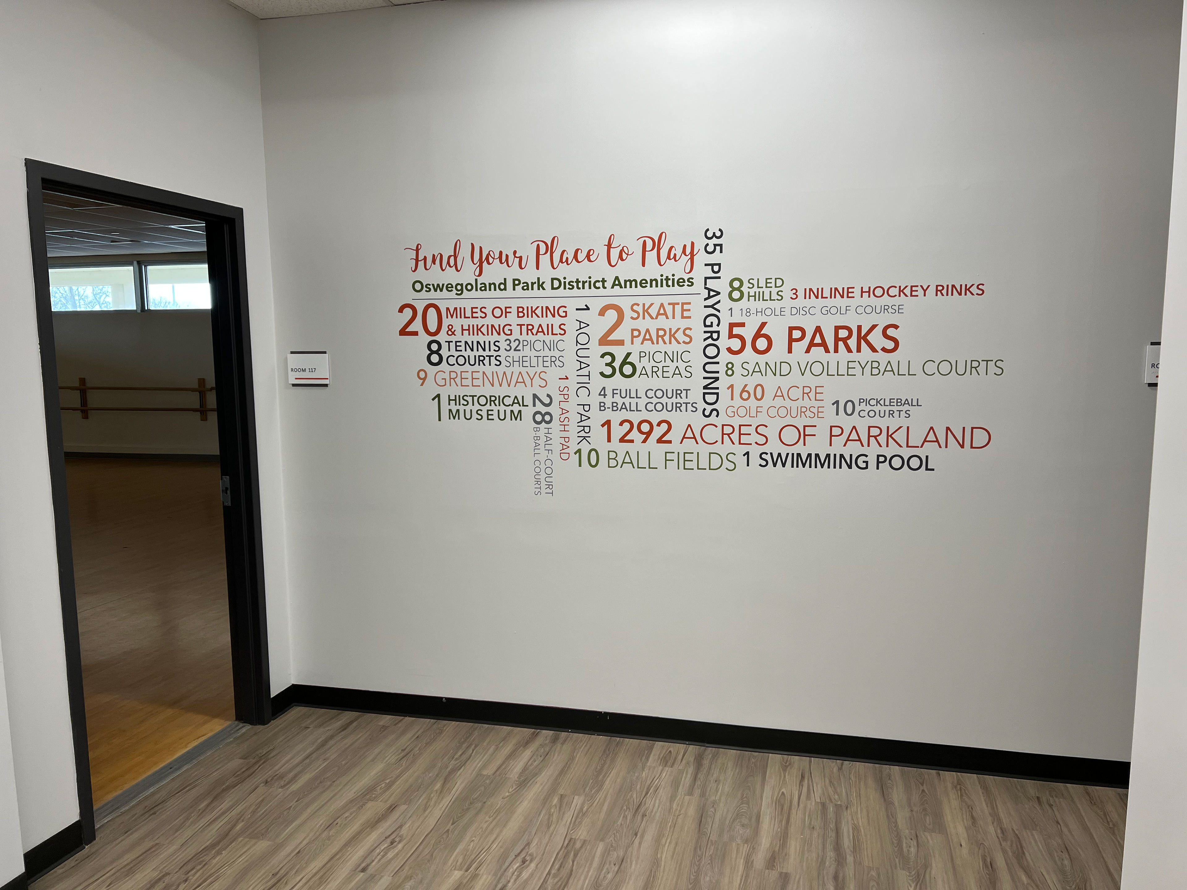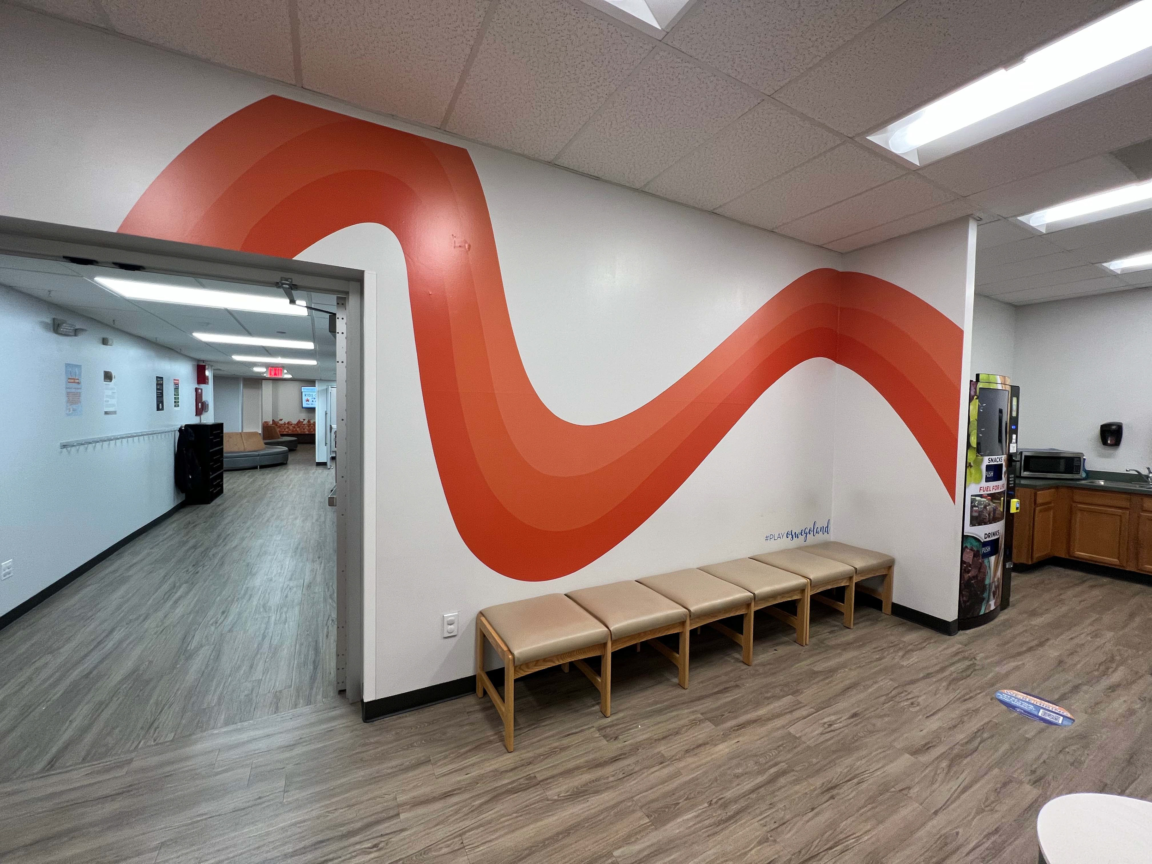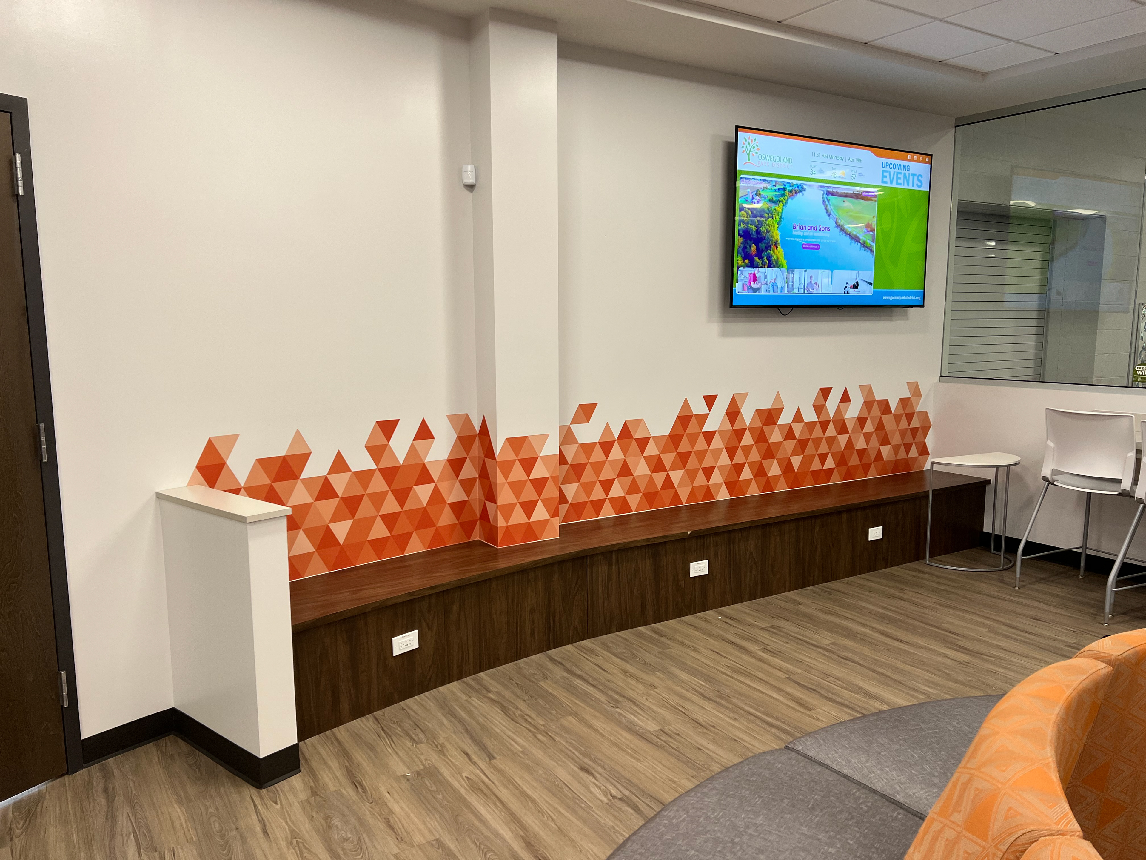 These decals were created for the Oswegoland Park District's Boulder Point Facility. The left decal displays the district's amenities. The vinyl application allows for the decal to be easily updated. The right decal was created to prevent scuffs in the lobby seating area. The triangle motif was created in the district's brand colors, which is present throughout the facility.