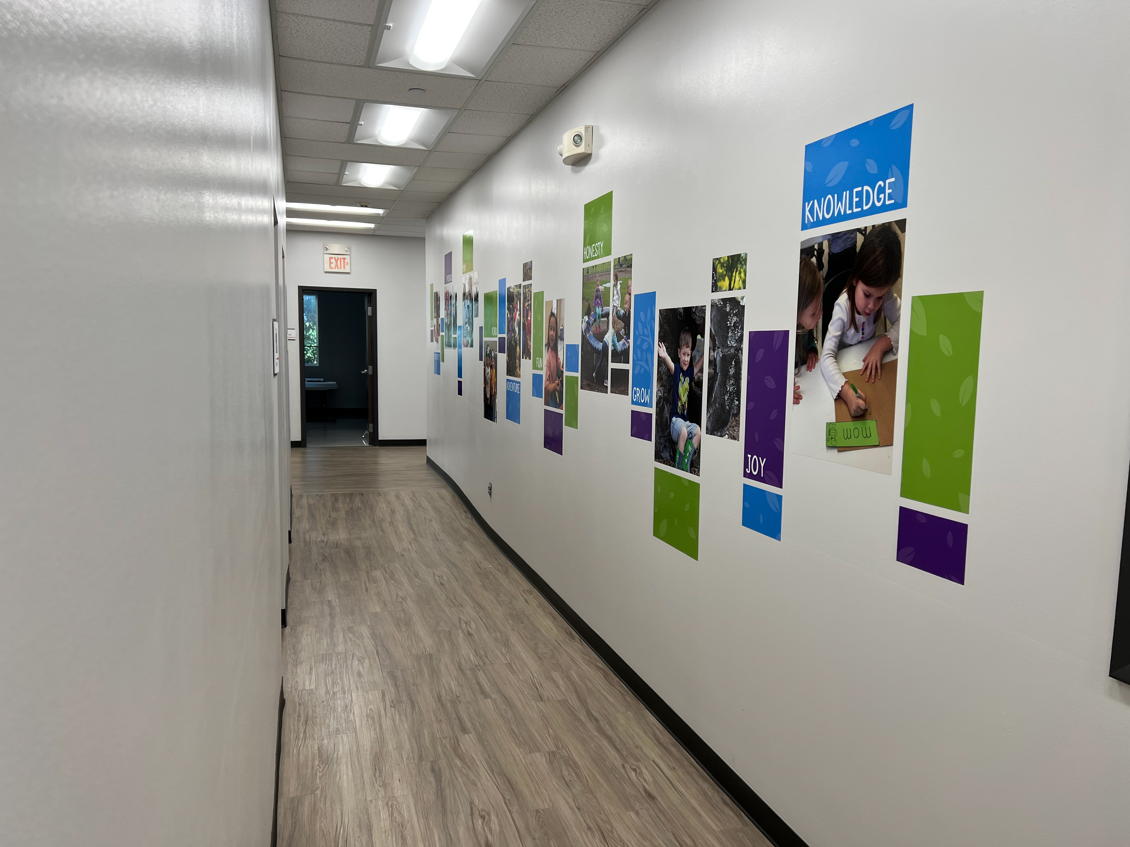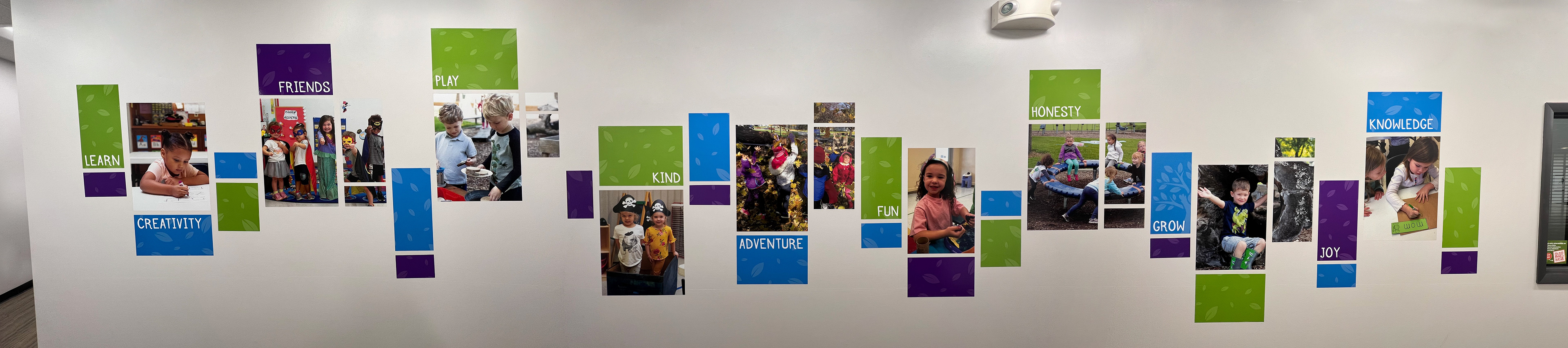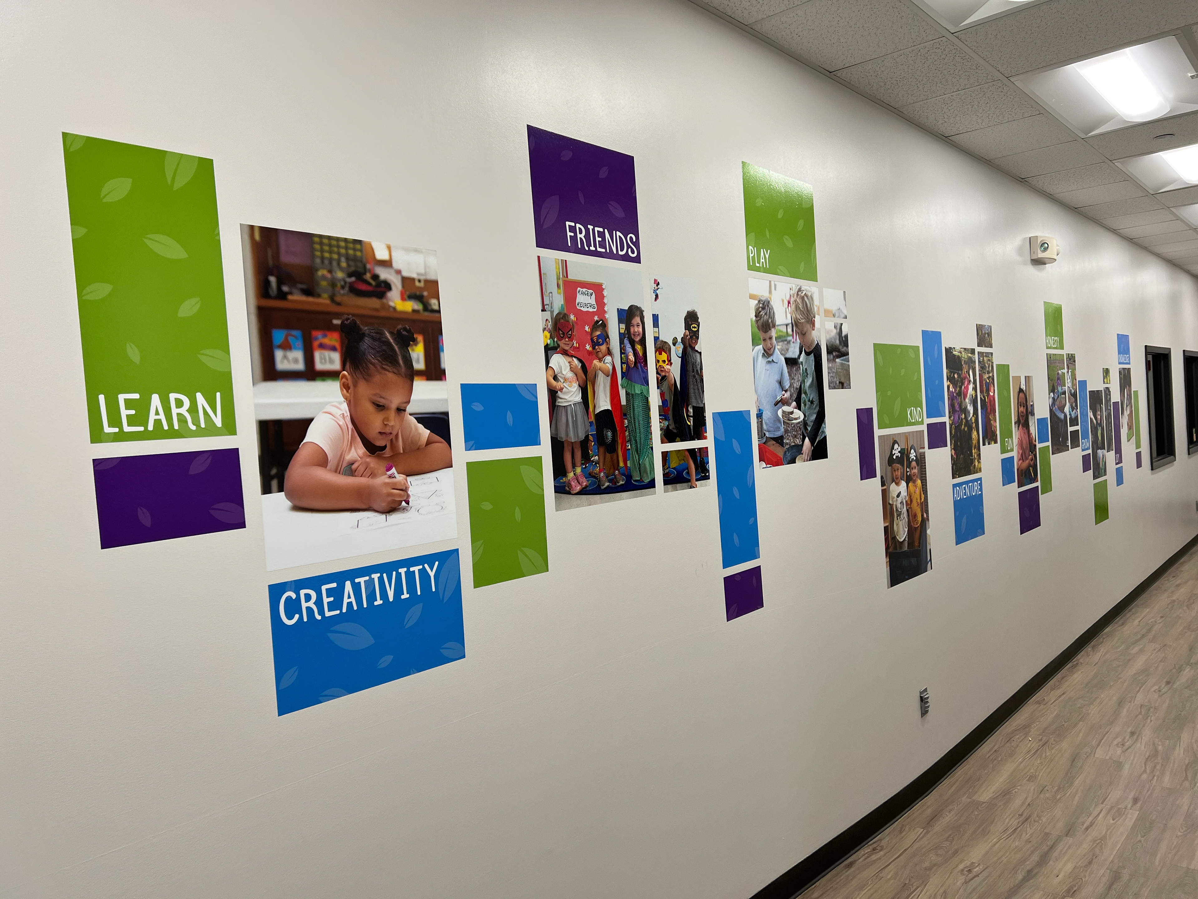 This decal covers a wall leading into the Oswegoland Park District's preschool. The decal includes words associated with the brand, as well as photos from classes, and the brand colors. The decals span the wall and measure 5.1' x 27.25'. The installation received 1st place for Large Scale Marketing in IAPD/IPRA's Agency Showcase awards.