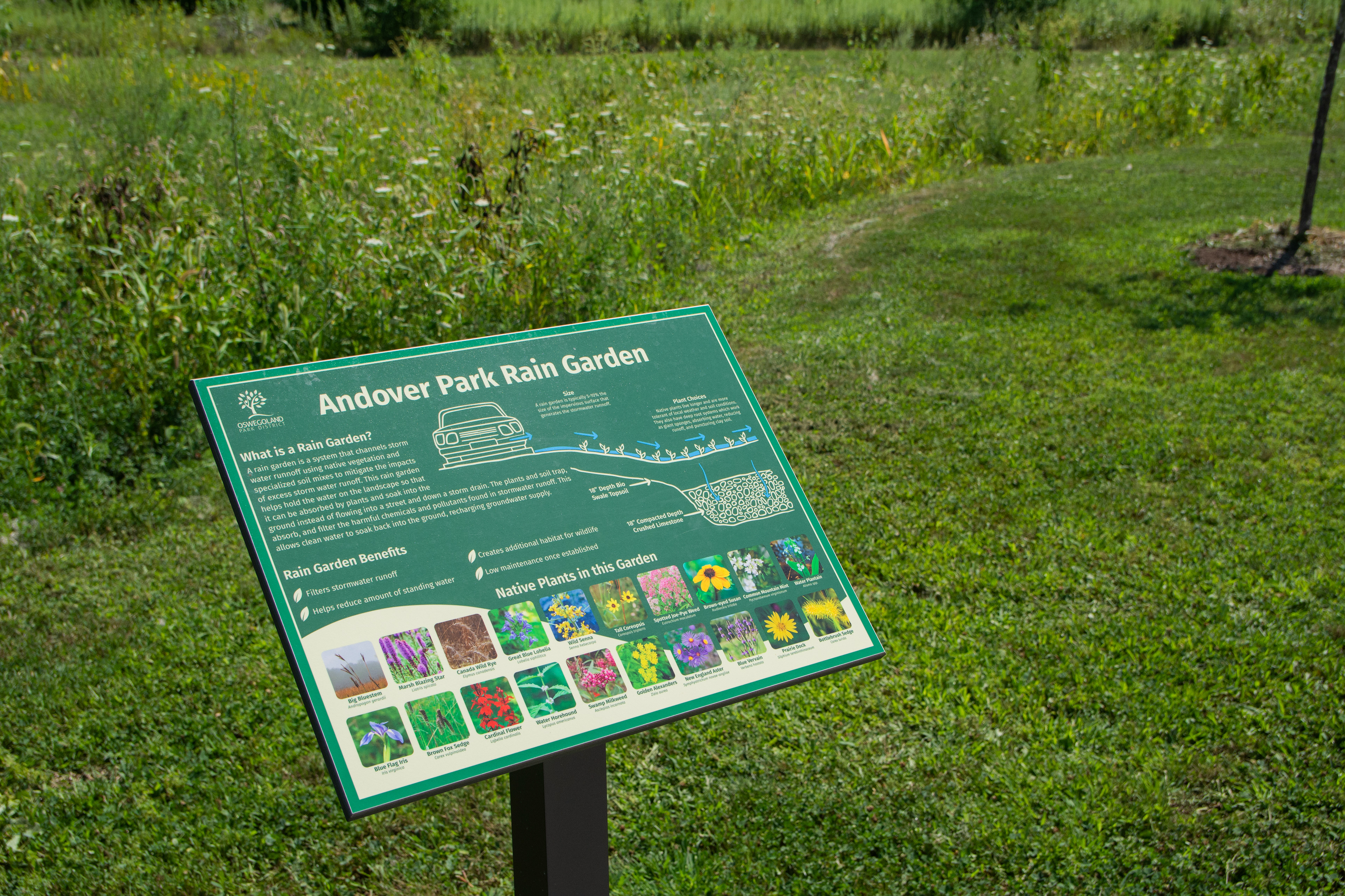 This interpretive sign marks the location of a rain garden. It provides educational information about the purpose and benefits of the garden.